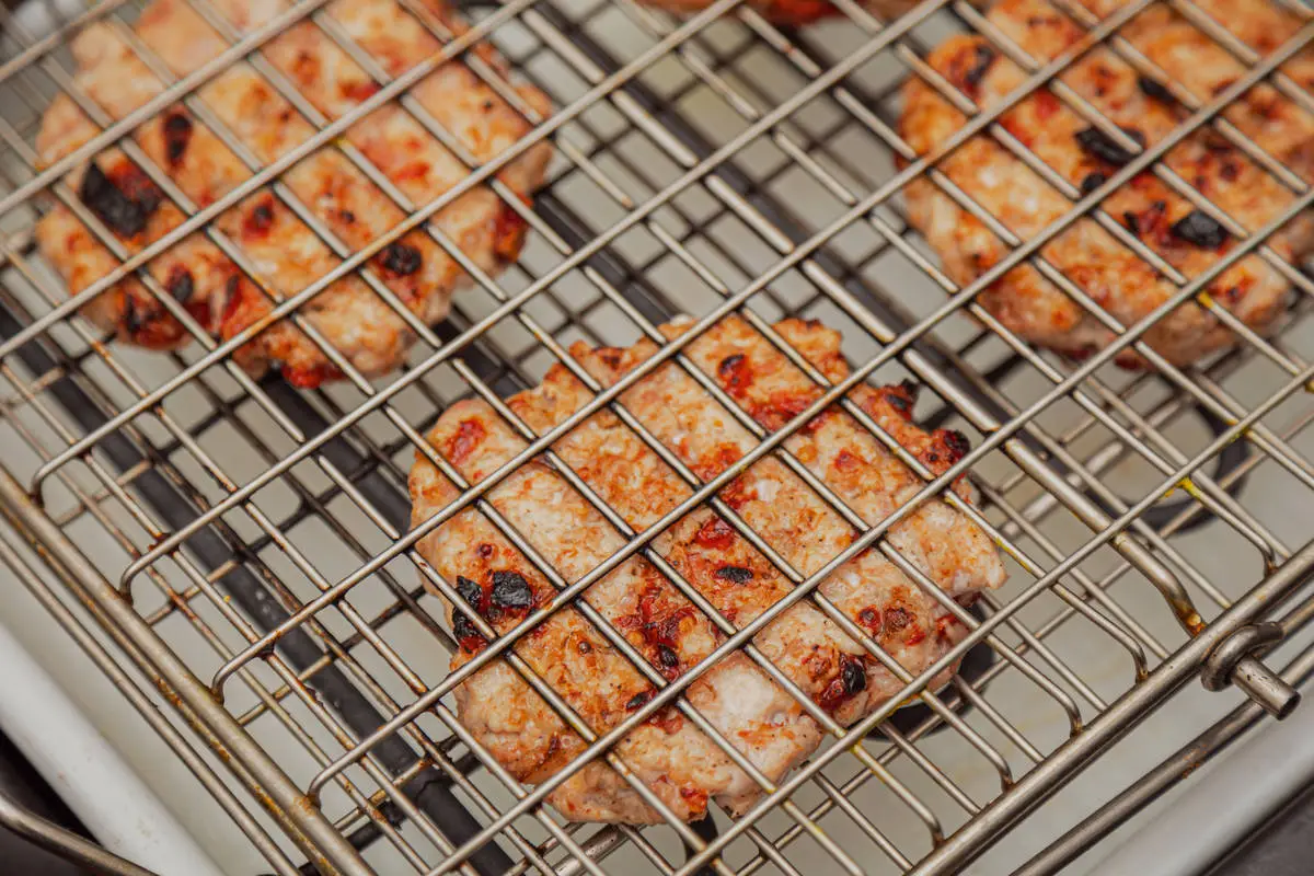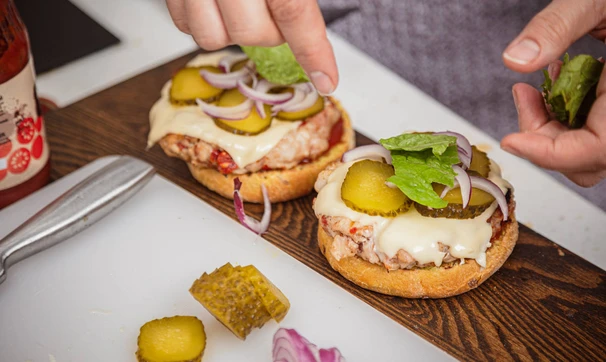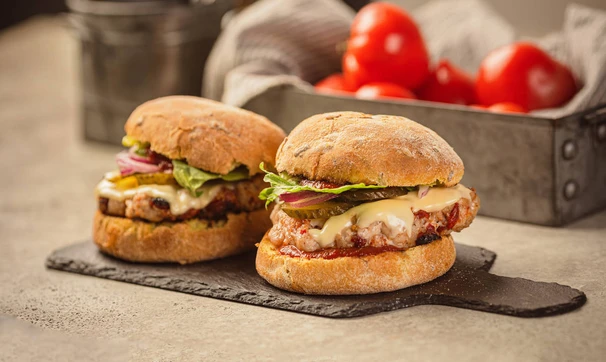 Сочная котлета из рубленой свинины с беконом и вялеными томатами — основа этих бургеров. Котлету можно пожарить дома на сковороде, а можно на решётке над углями.