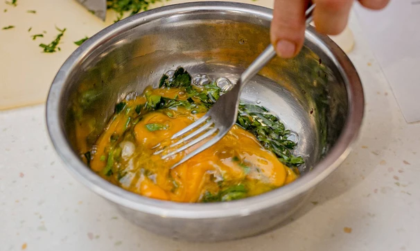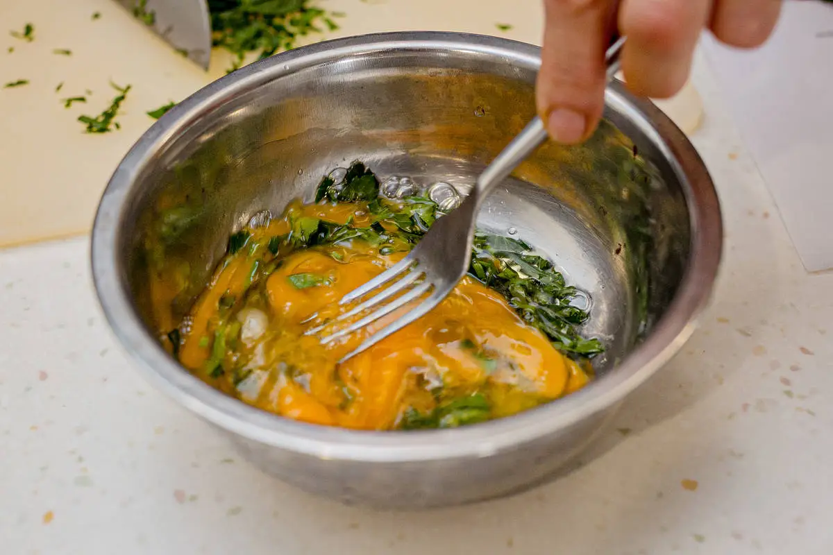 Разбейте яйца в мисочку, туда же добавьте мелко нарезанную петрушку и соль, взбейте вилкой.