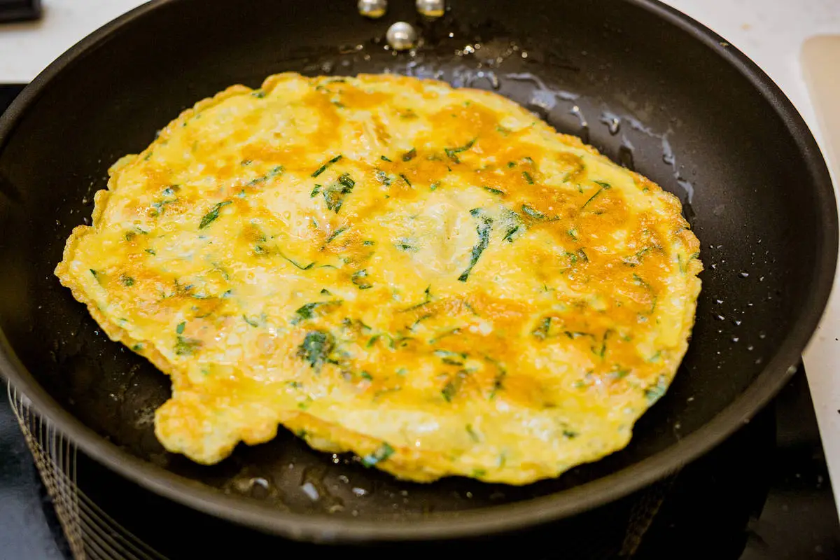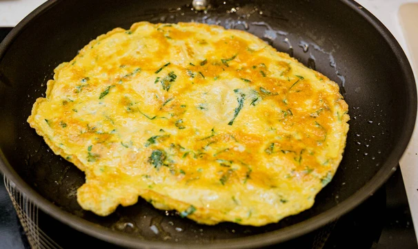 Пожарьте омлет на горячей сковороде. Готовый омлет разрежьте на части.