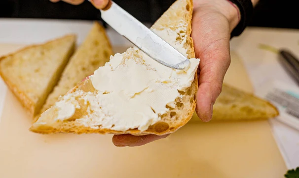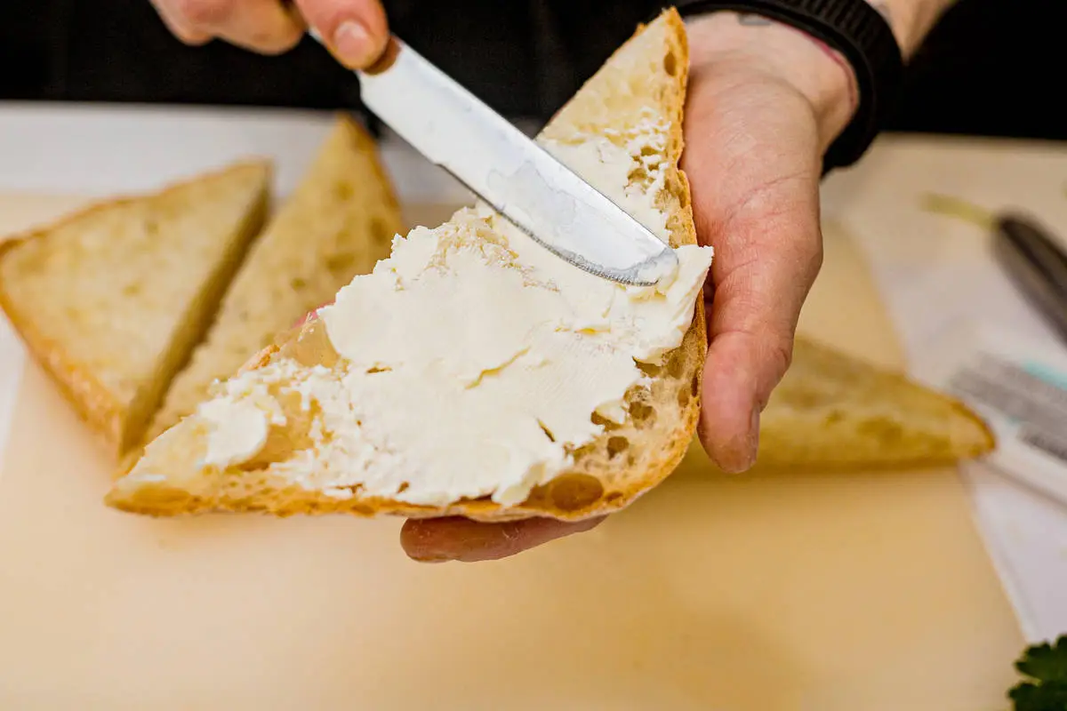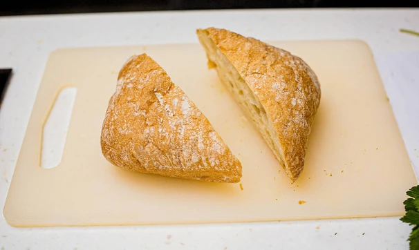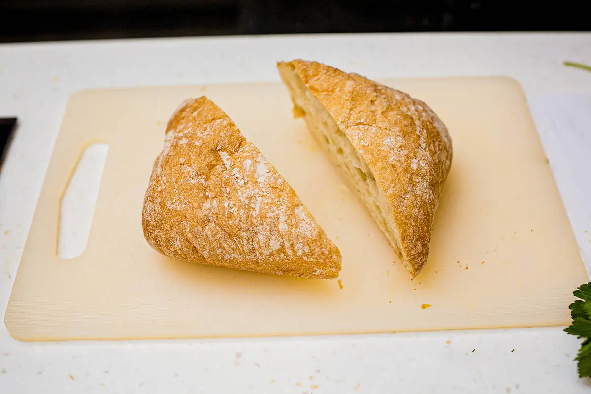 От чиабатты отрежьте 2 угла, чтобы получились треугольники, разрежьте каждый пополам вдоль.