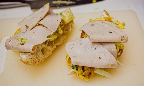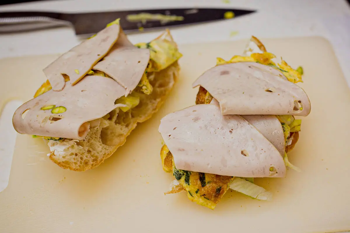 Выложите на сыр ломтики мортаделлы, затем омлет и листья айсберга.