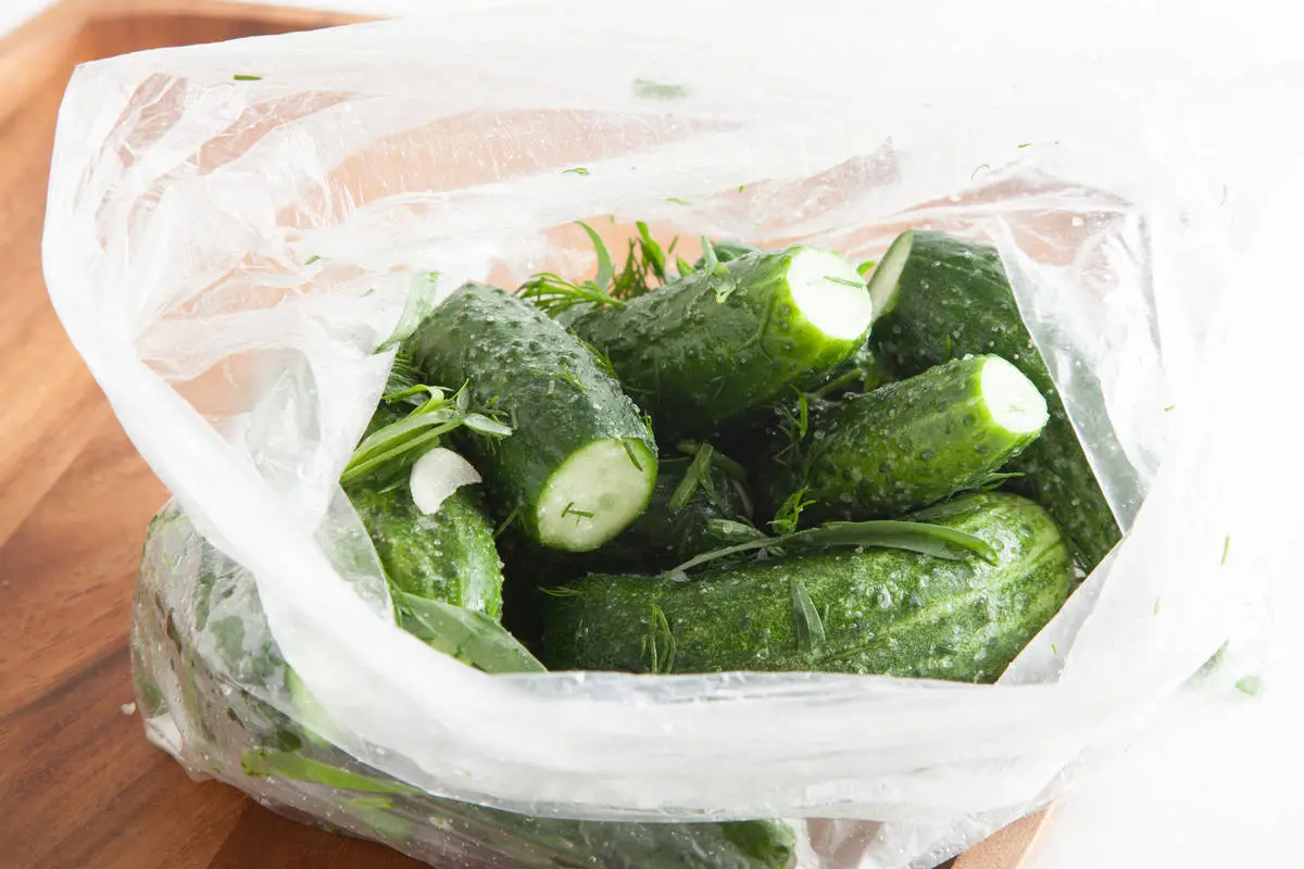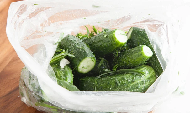 Сложите всё в пакет вместе с огурцами, хорошо встряхните, чтобы соль равномерно распределилась по огурцам. Пакет завяжите и оставьте в холодильнике на 4-5 часов. Хрустящие и ароматные малосольные огурчики готовы!