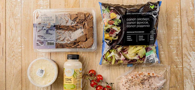 Для этого салата Цезарь мы отобрали максимально готовые составляющие: филе грудки уже приготовлено и нарезано, сыр натёрт, соус готов, — осталось только собрать всё в тарелке. Мы решили добавить ржаные сухарики вместо обычных пшеничных, но вы можете выбрать те, которые больше нравятся.