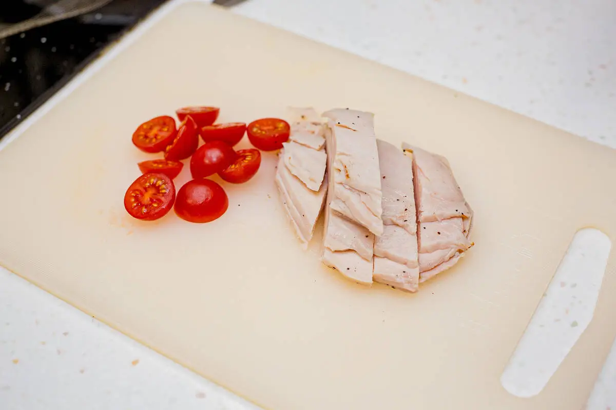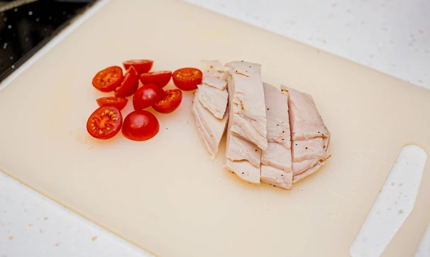 Вскройте упаковку с филе куриной грудки, выложите ломтики курицы на салат, добавьте черри и заправьте салат соусом. Посыпьте пармезаном и добавьте сухарики. Цезарь готов!