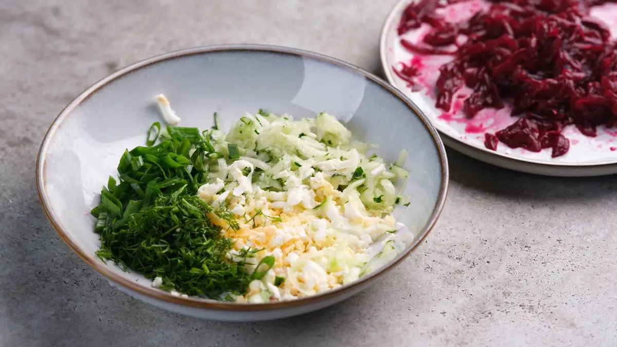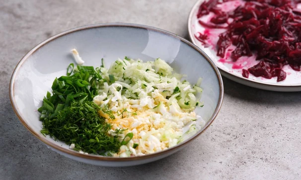 Свёклу отварите до готовности и снимите кожицу. Можно использовать готовую вакуумированную отварную свёклу. Измельчите свёклу на тёрке, посолите и полейте лимонным соком, оставьте мариноваться на 10–15 минут.