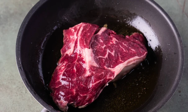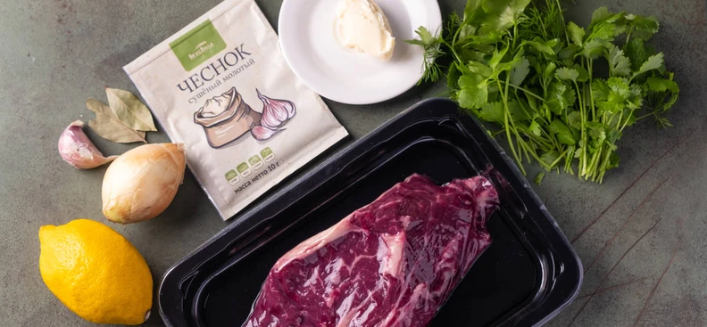 Стейк выньте из упаковки, оботрите бумажным полотенцем и оставьте при комнатной температуре на 10 минут.