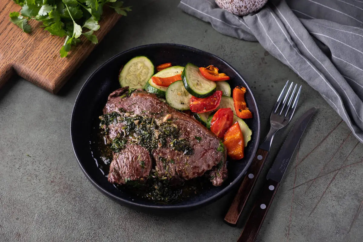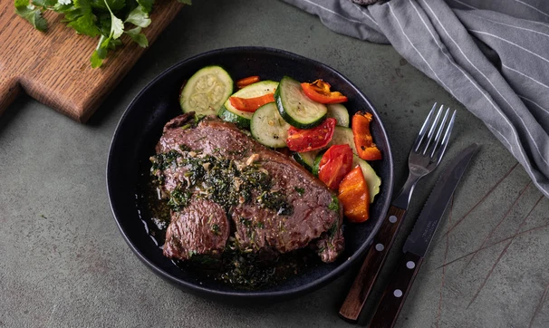 Подавайте стейк с гарниром из овощей, полив соусом, оставшимся в сковороде. Приятного аппетита!