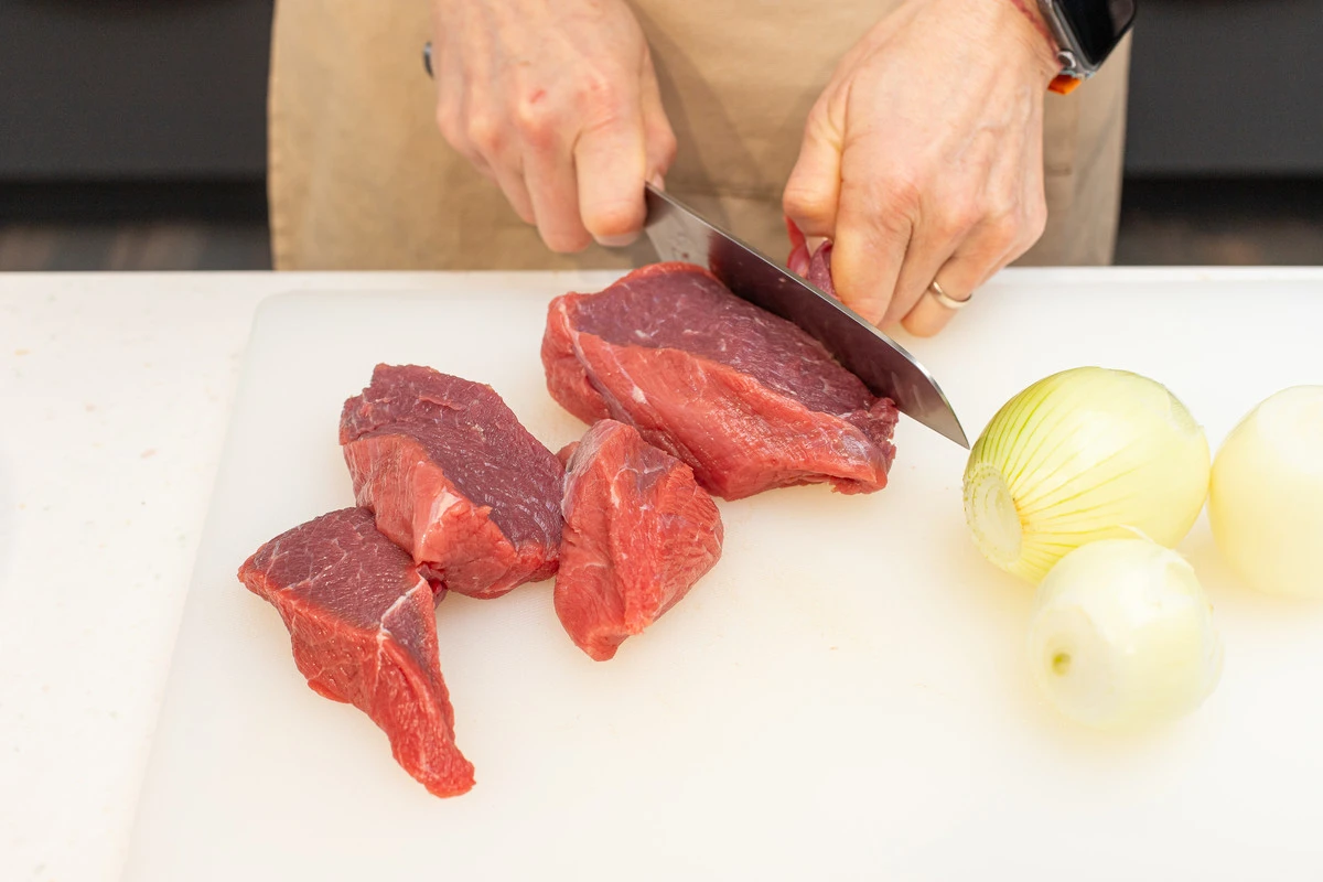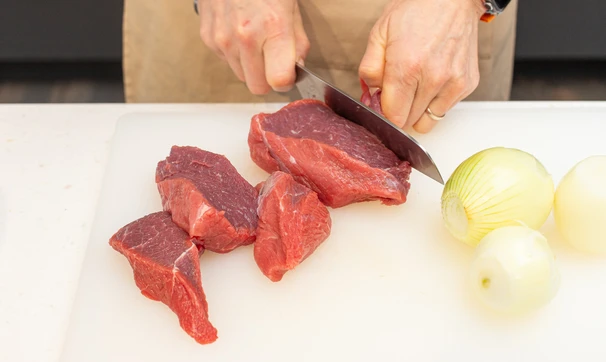 Мясо нарежьте кусочками небольшого размера. Лук почистите и нарежьте четвертинками колец.