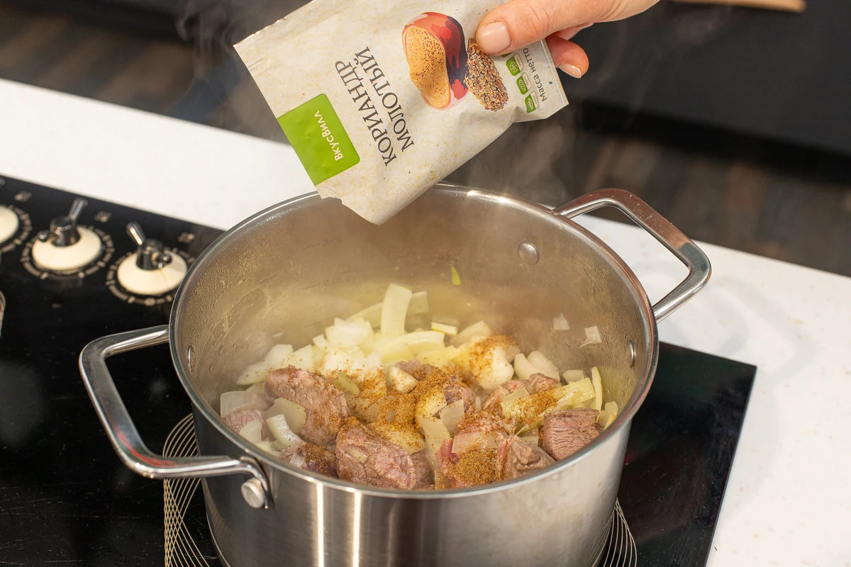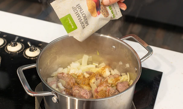 Разогрейте кастрюлю и выложите в неё мясо и лук, добавьте кориандр и перемешайте. Накройте крышкой и готовьте на средне-слабом огне примерно 30 минут.