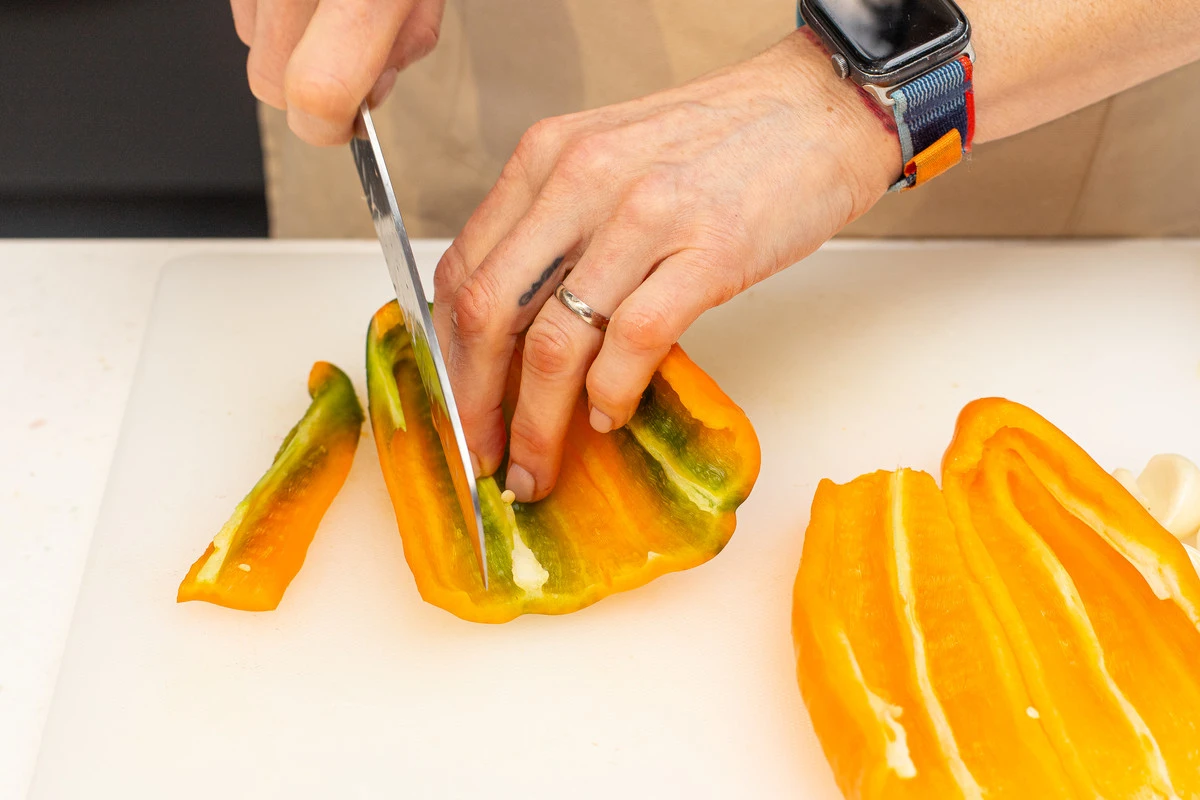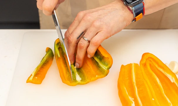 Перец очистите от семян и нарежьте кусочками среднего размера.