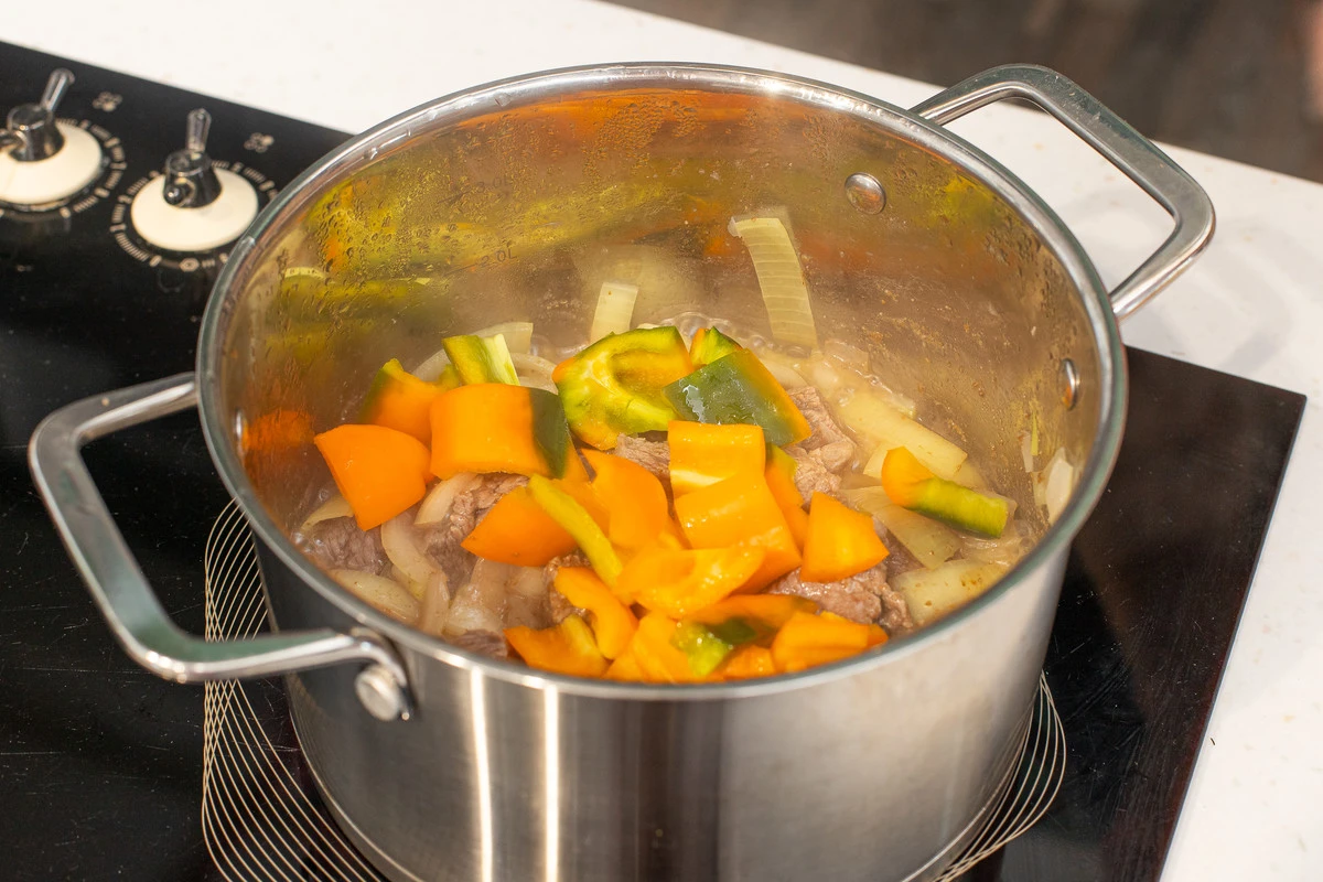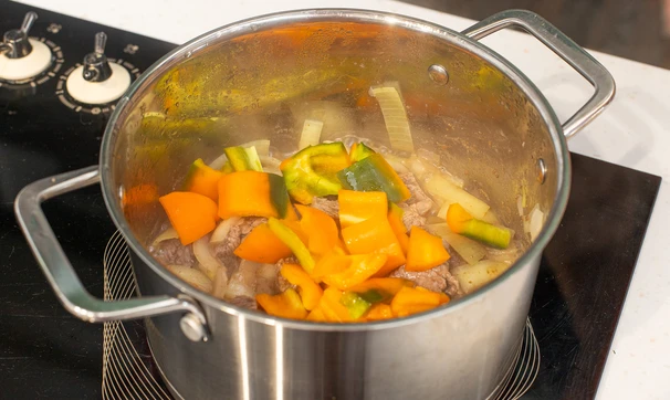 Добавьте к мясу с луком и готовьте под крышкой ещё примерно 15 минут.