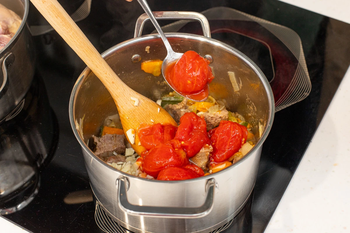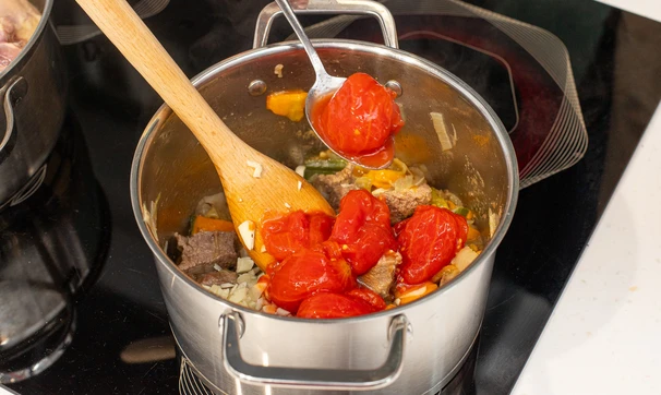 Чеснок почистите и нарежьте кусочками. Добавьте томаты в собственном соку вместе с соком и нарезанный чеснок к мясу.