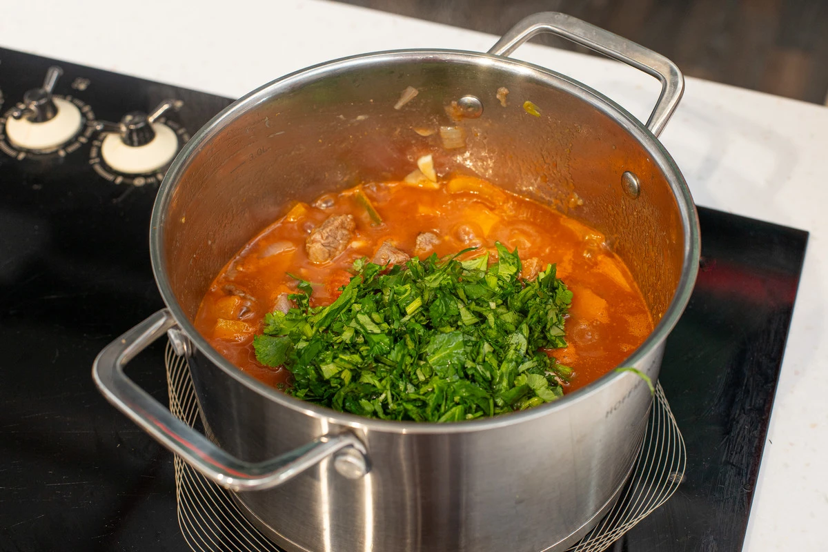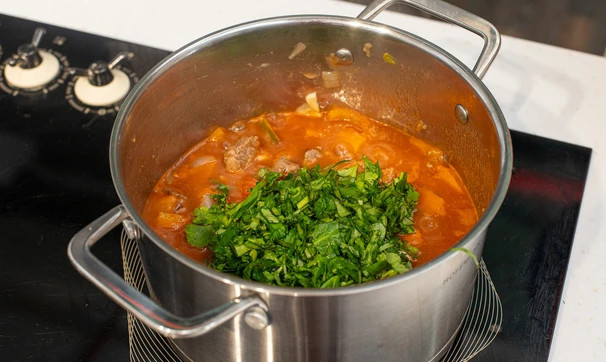 Зелень нарежьте и также положите в кастрюлю. Добавьте специи, острый перец по желанию, перемешайте и тушите всё вместе ещё минут 20–30. Затем снимите кастрюлю с чашушули с огня и оставьте настаиваться под крышкой ещё 20–30 минут.