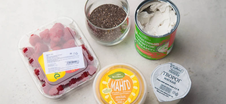 В прозрачные стаканы выложите слоями манговое пюре, творог, чиа, последним слоем манговое пюре, украсьте свежей малиной и подавайте!