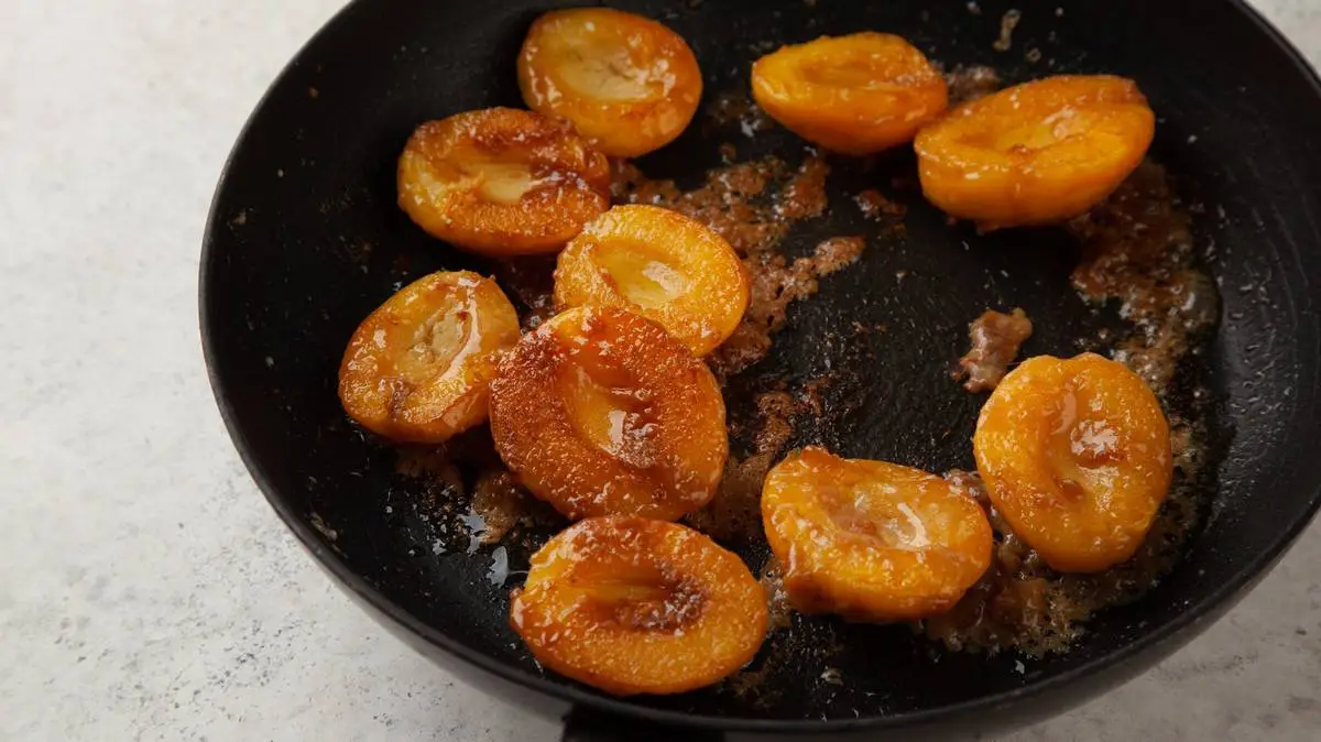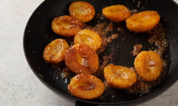Абрикосы разрежьте пополам, удалите косточки. В сковороде растопите на среднем огне сахар, выложите абрикосы срезами вниз и добавьте сливочное масло, готовьте несколько минут. Сахар должен превратиться в густую карамель, главное, не передержите, чтобы она не стала горькой.
