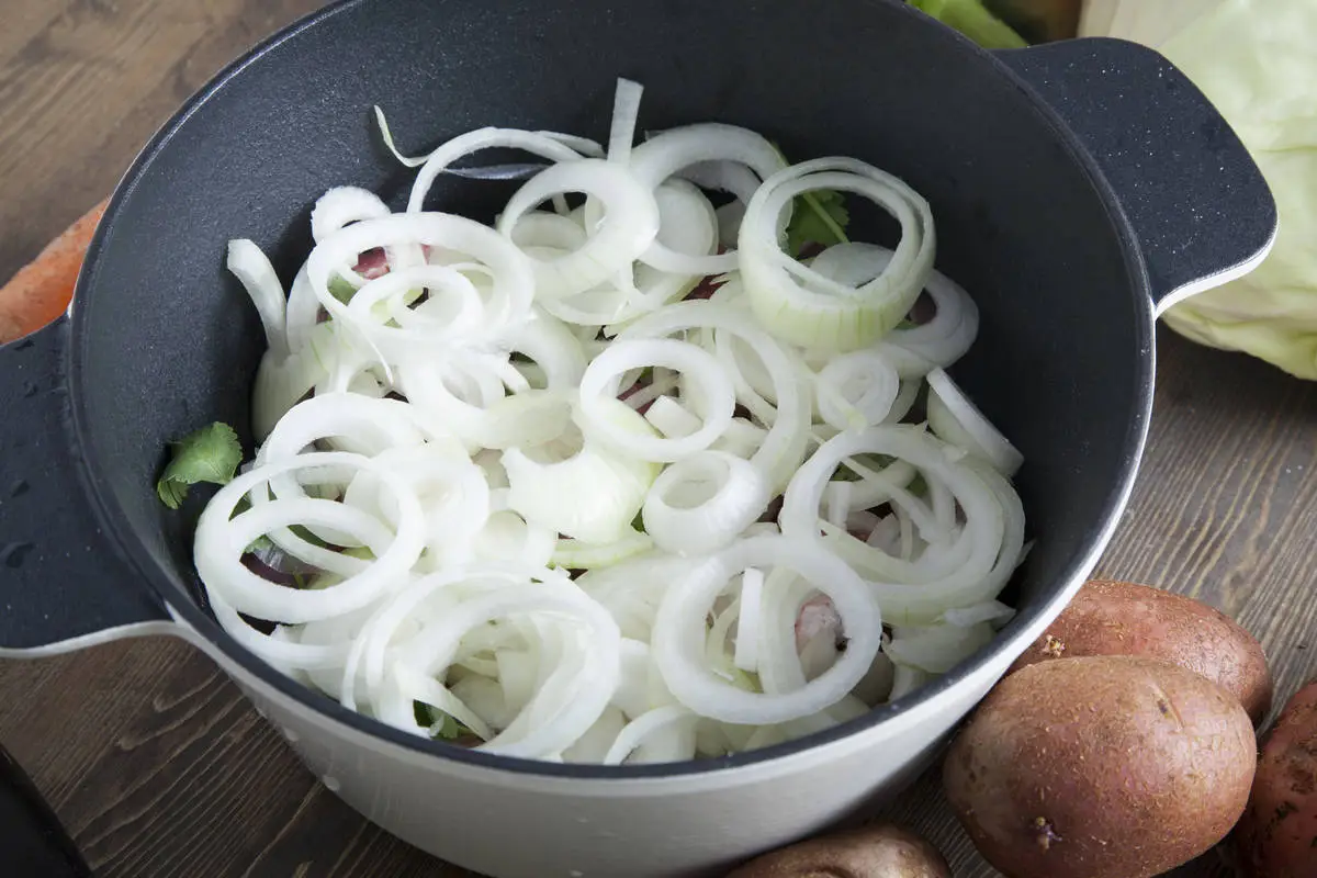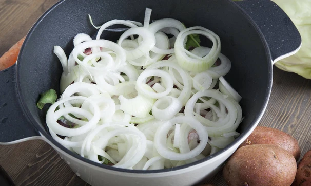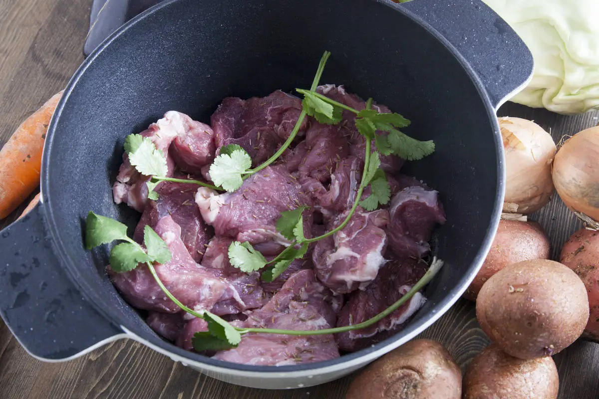 Вам понадобится толстостенная кастрюля, утятница или казан, если вдруг есть медленноварка — идеально подойдет! Баранину нарежьте крупными кусками, посолите, посыпьте зирой и уложите на дно.