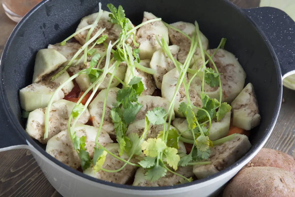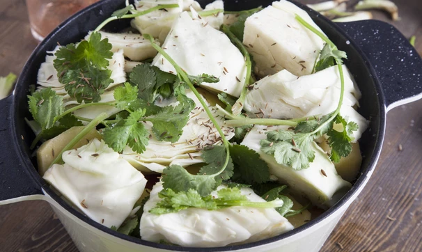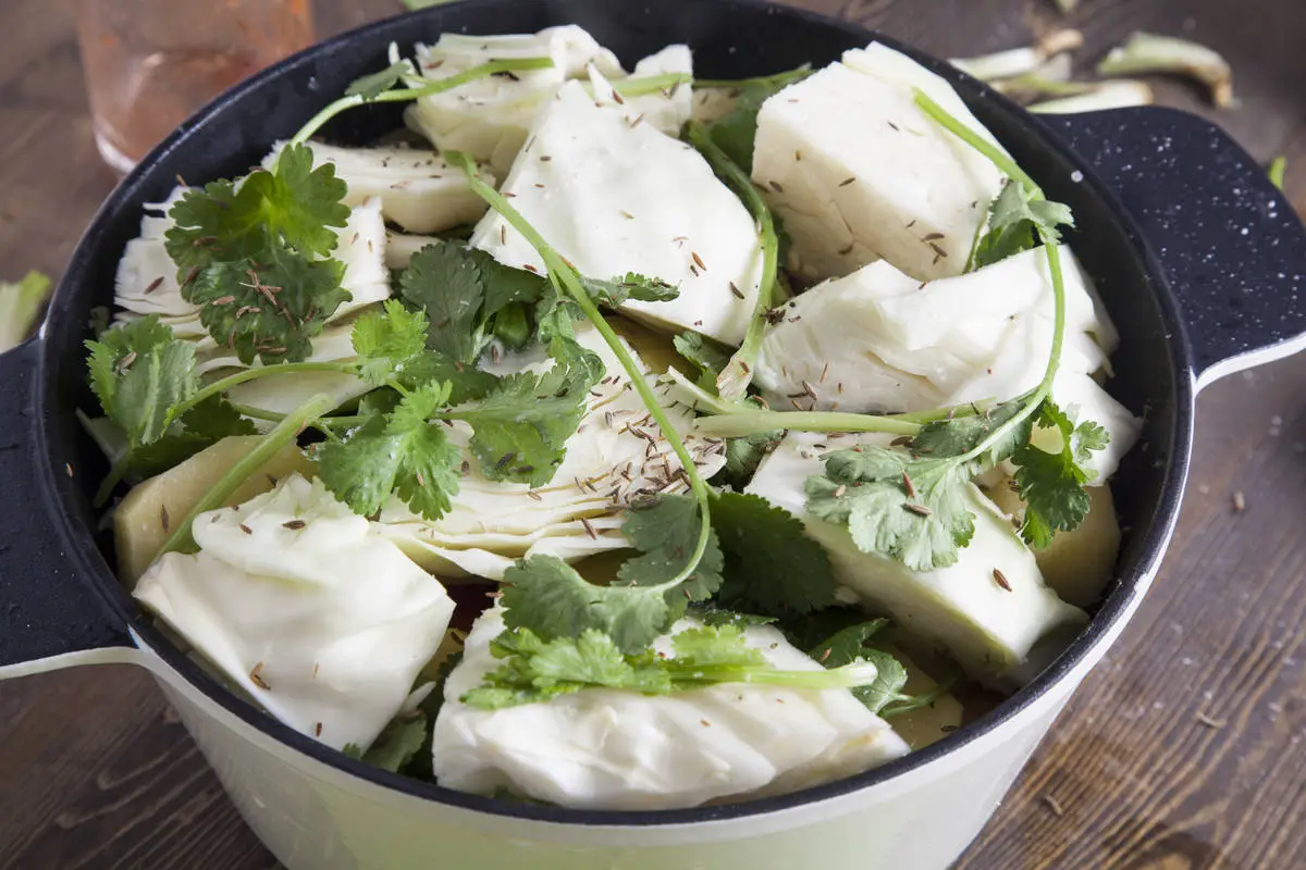 Снова посолите и положите оставшуюся кинзу, накройте плотно одним-двумя целыми листами капусты. Осталось закрыть все крышкой и поставить на очень-очень медленный огонь или в духовку на 90-100 С и забыть о кастрюле на 4-5 часов.