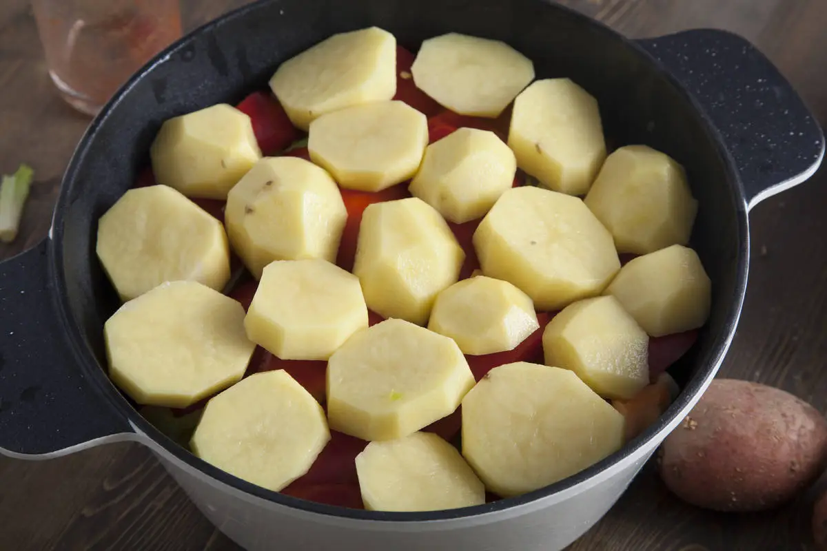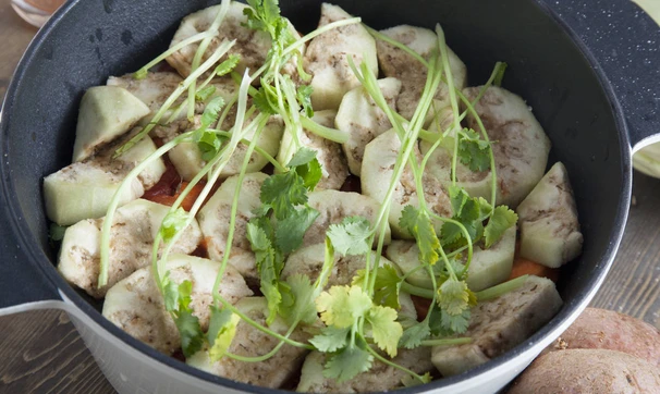Баклажаны, картофель, морковь и помидоры нарежьте толстыми кружками. Выкладывайте овощи слоями (каждый слой нужно посолить, посыпать растертой в ладонях зирой и добавить несколько веточек кинзы вместе со стеблями): нарезанный кольцами лук...