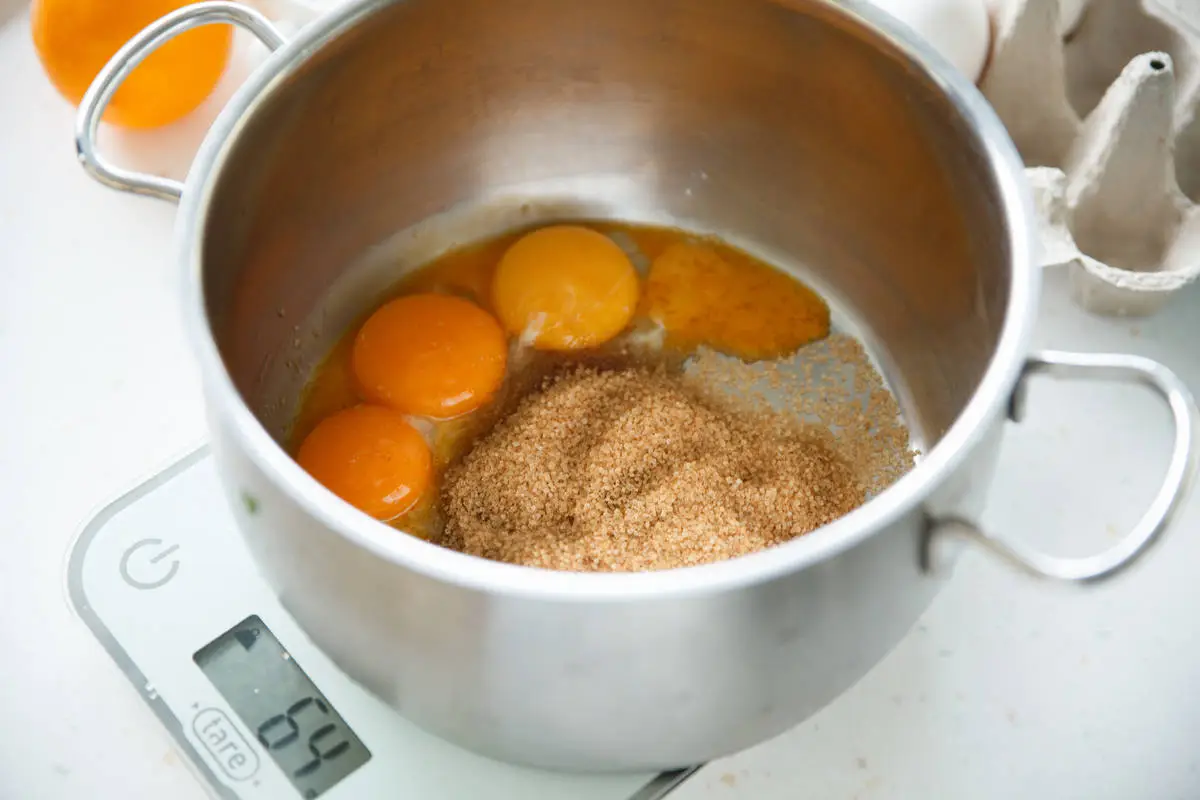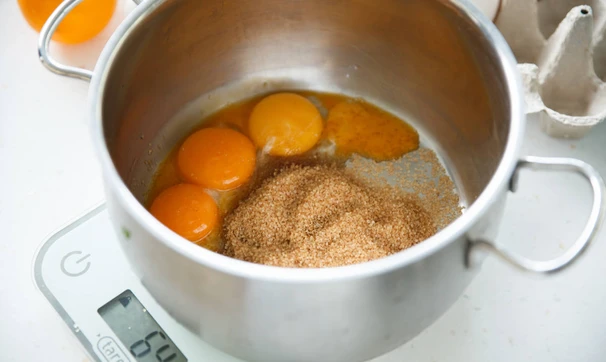 Желтки взбейте с сахаром при помощи миксера, взбивайте до полного растворения сахара.