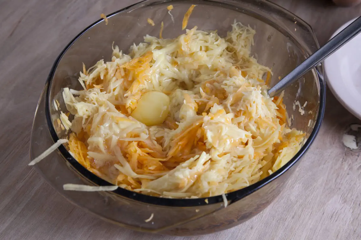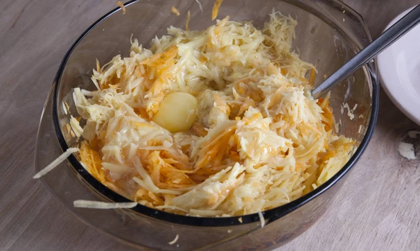 Картофель и тыкву очистите, натрите на терке, половину на крупной, половину на мелкой, добавьте куркуму, черный молотый перец, муку и яйца, хорошо перемешайте.