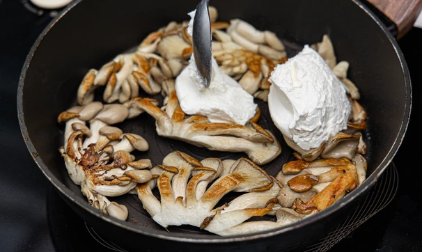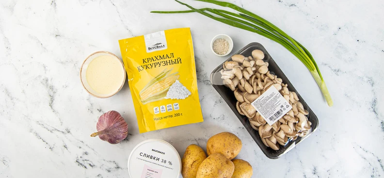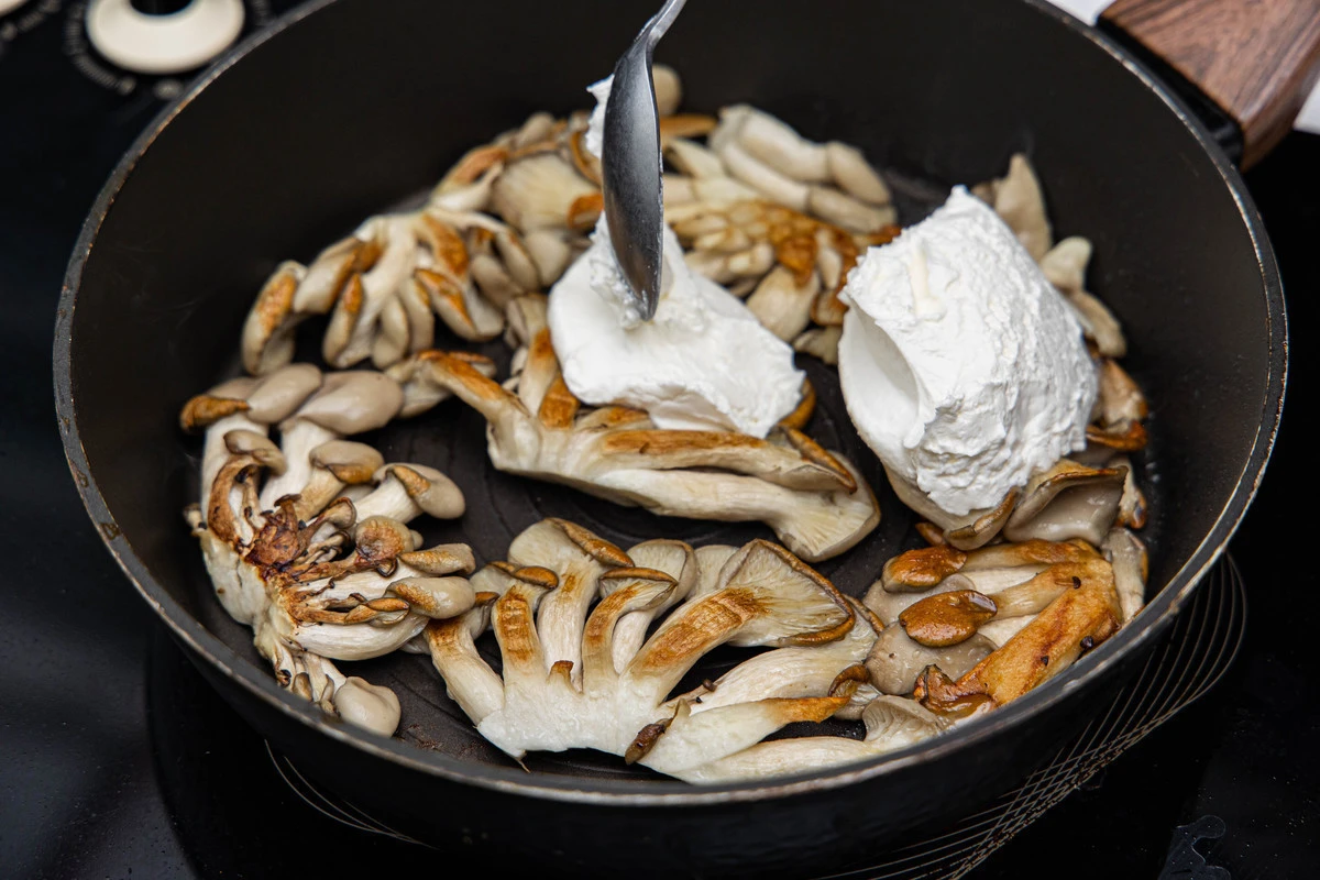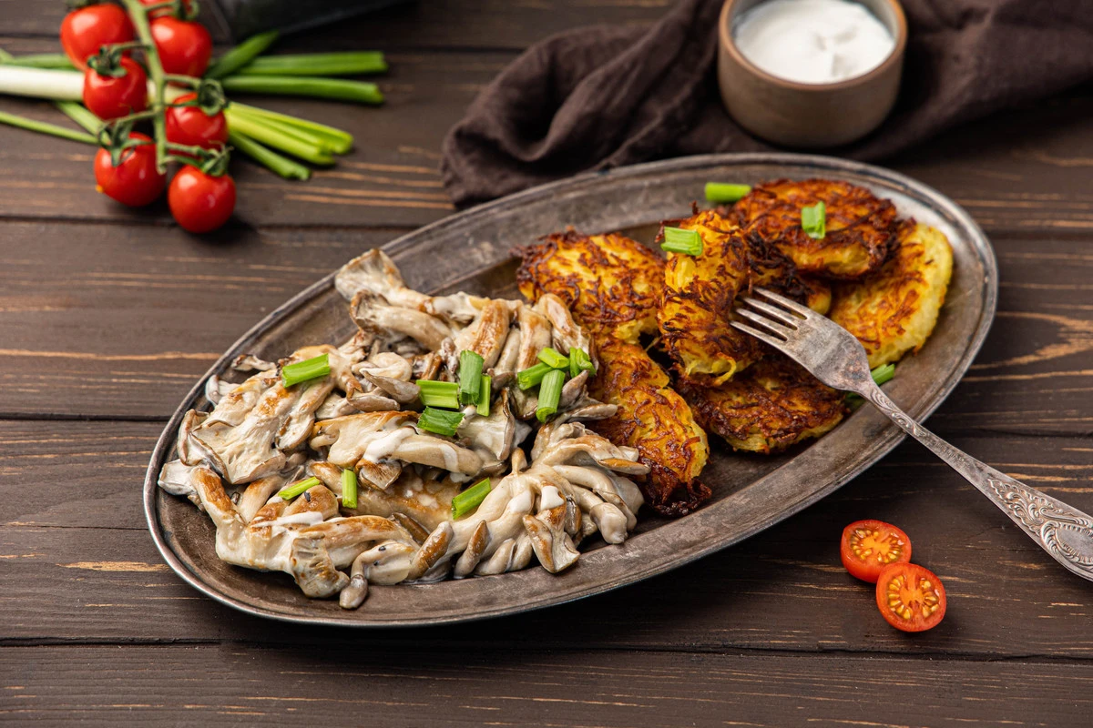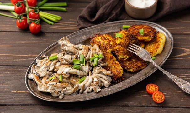 Грибы, картошка и сметана — это классика. Мы решили немножко разнообразить вкус и заменили сметану жирными сливками, а из картофеля сделали хрустящие драники для большего контраста текстур. Получилось, кстати, очень вкусно.
