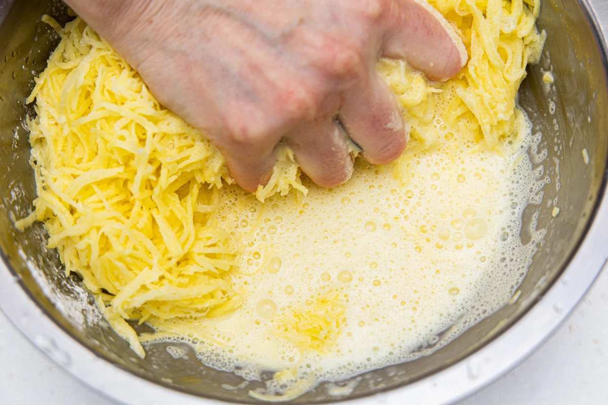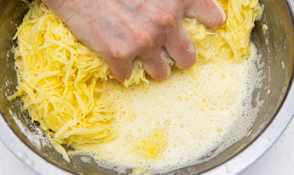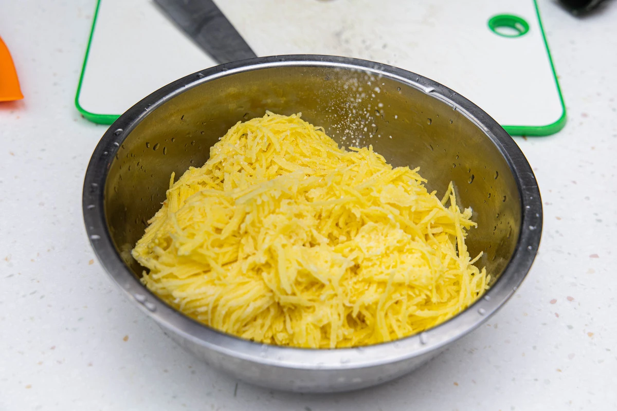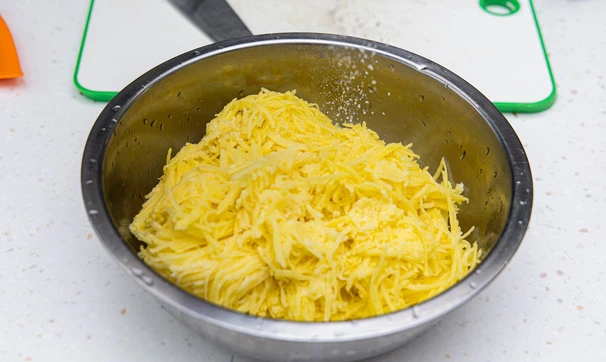Картофель очистите, измельчите на тёрке. Добавьте крахмал, перемешайте и оставьте на 20 минут.