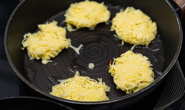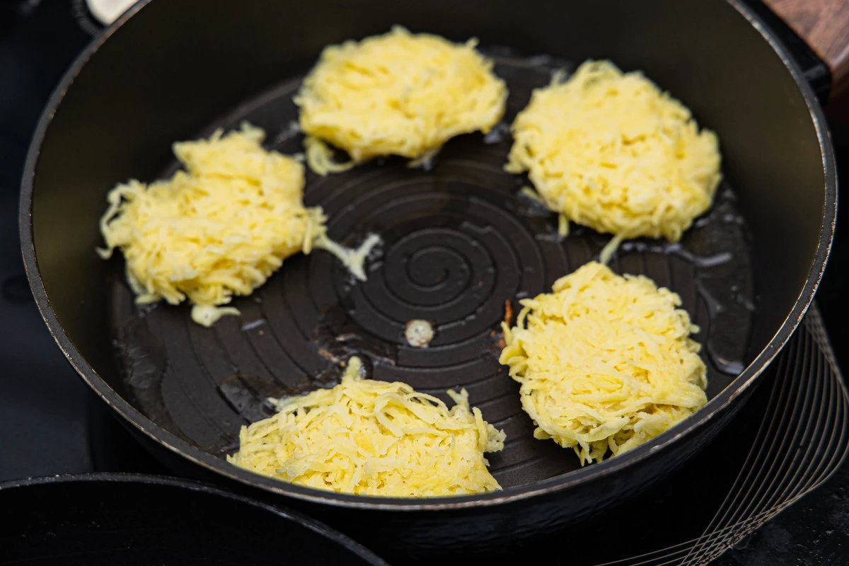 Жарьте картофельные драники на горячей сковороде, выкладывая массу ложкой. Получившиеся драники сохраняйте в тёплом месте.