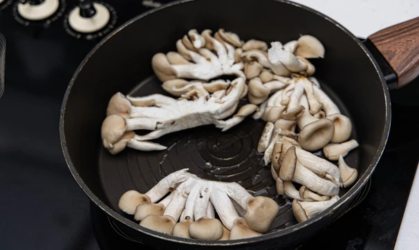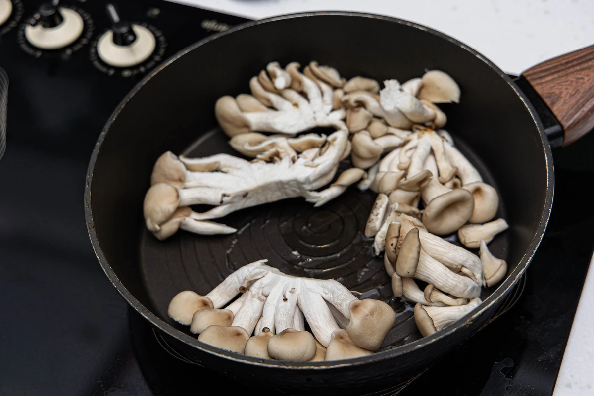 Обжарьте грибы на небольшом количестве масла до золотистости с двух сторон, включив сильный огонь.