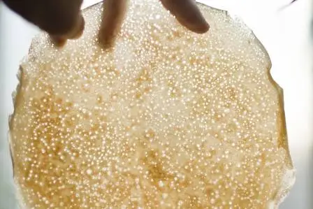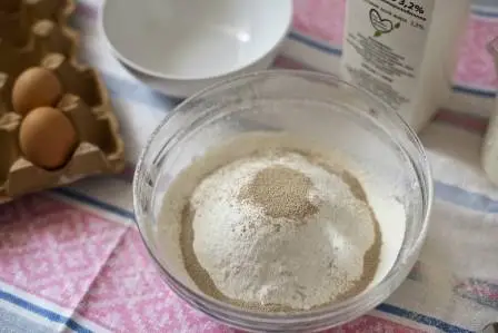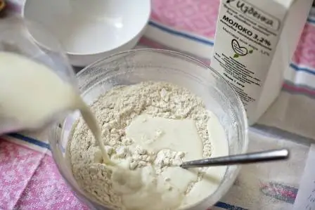 Молоко подогрейте до комнатной температуры и влейте в муку. Тщательно размешайте и оставьте в теплом месте на 2-3 часа, тесто должно увеличится в два раза.