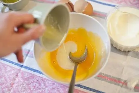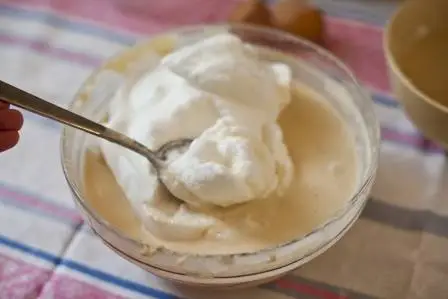 Отделите белки от желтков. К желткам добавьте сахар и соль и тщательно разотрите вилкой, затем влейте растопленное сливочное масло.