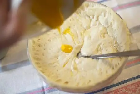 Влейте желтки с маслом в поднявшееся тесто, тщательно размешайте, тесто должно быть жидким, как кефир, если густовато, можно разбавить теплой водой.