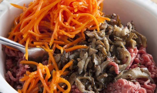 Смешайте с сырым фаршем, добавьте корейскую морковь, пропущенные через пресс чеснок и имбирь, часть кинзы немного перца для остроты, часть порубленной кинзы и соевый соус, тщательно все перемешайте.