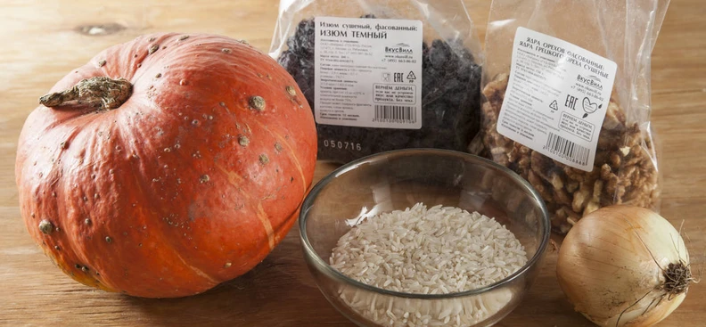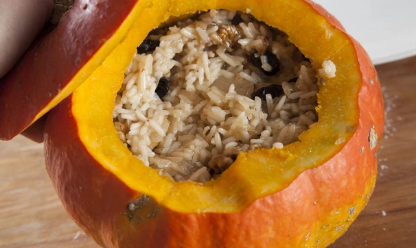 Этот рецепт — настоящий конструктор! Добавьте обжаренное мясо, особенно уместна здесь баранина, и получится плов в тыкве, уберите лук и положите побольше сухофруктов (вяленую вишню, курагу, чернослив) — получится замечательный десерт!