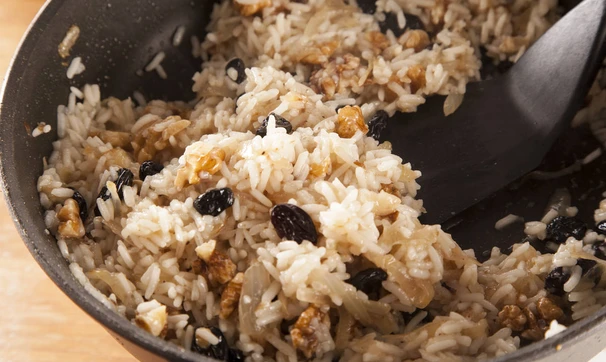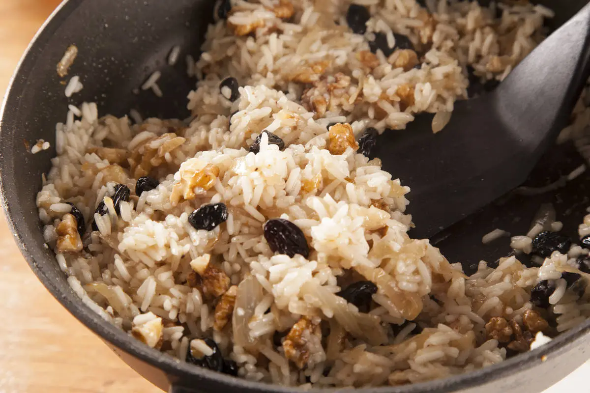 Лук порежьте полукольцами и обжарьте на топленом масле вместе со специями, затем добавьте изюм, орехи рис, перемешайте, посолите по вкусу, начинка должна получиться достаточно влажной.