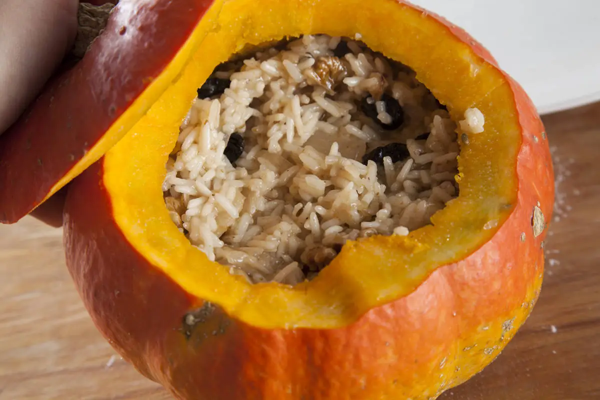 Готовую тыкву очень красиво подать на стол целиком, раскладывайте рис по тарелкам при помощи ложки, аккуратно зачерпывая тыквенную мякоть.