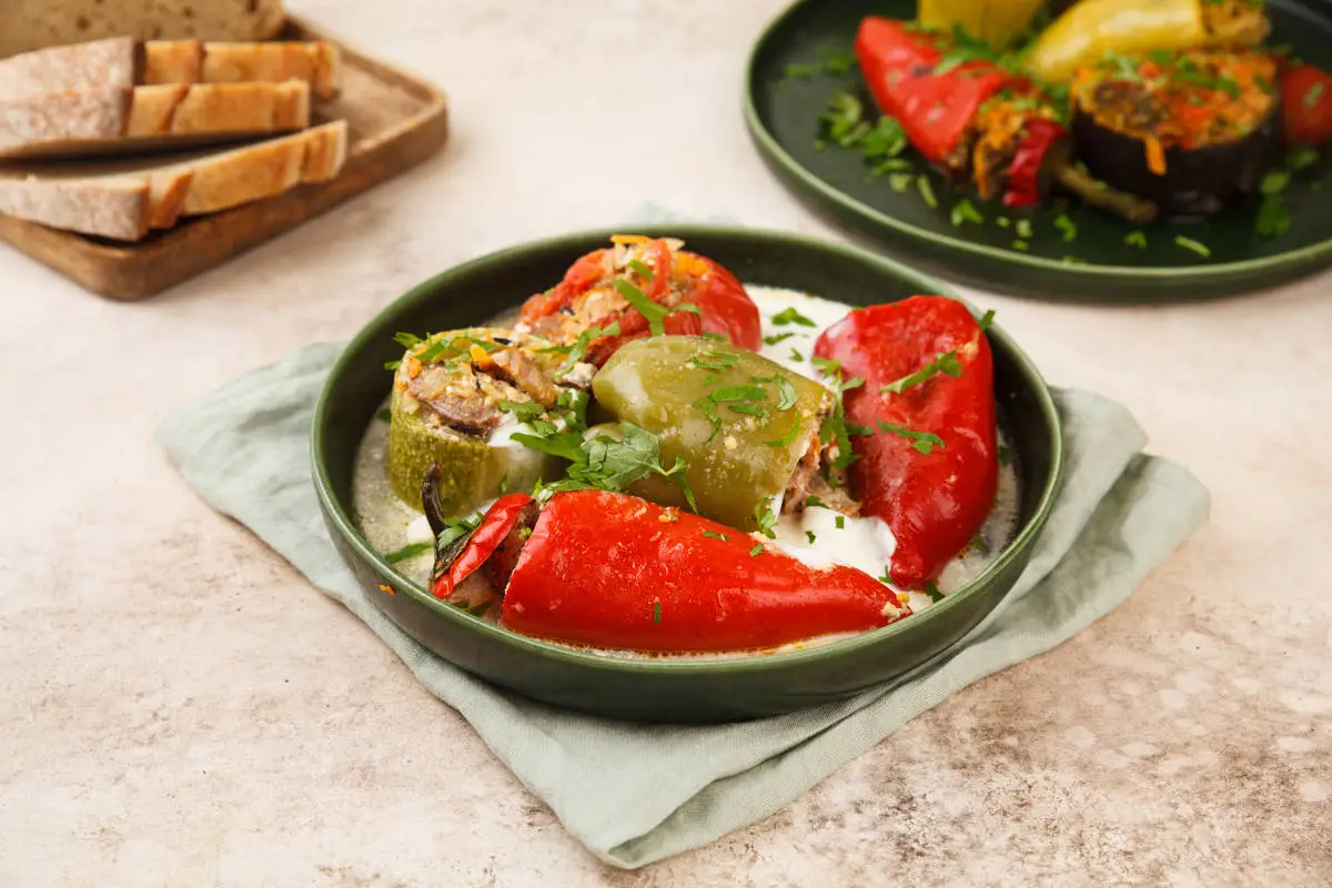 Этот рецепт — буквально лаборатория сочетаний: вкус блюда будет меняться в зависимости от вашего выбора овощей (непременно используйте крупные экземпляры, в них удобнее разместить заправку), мяса, круп, соусов. Экспериментируйте!