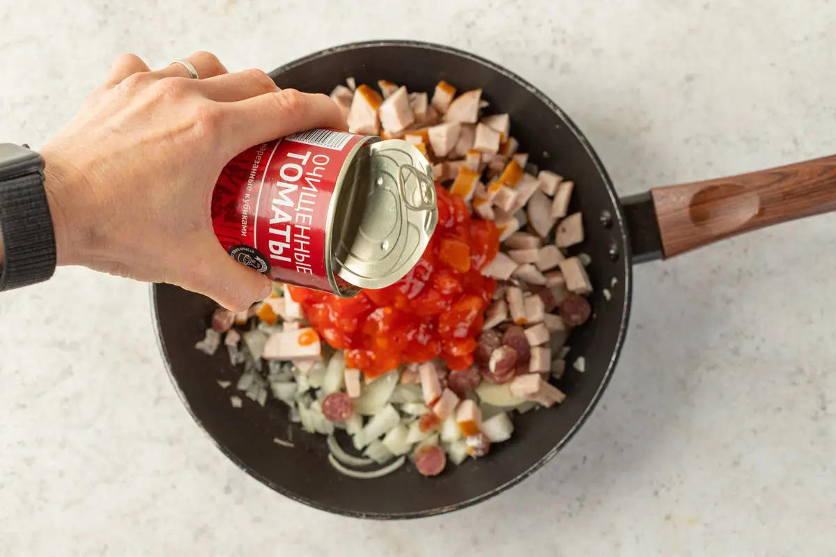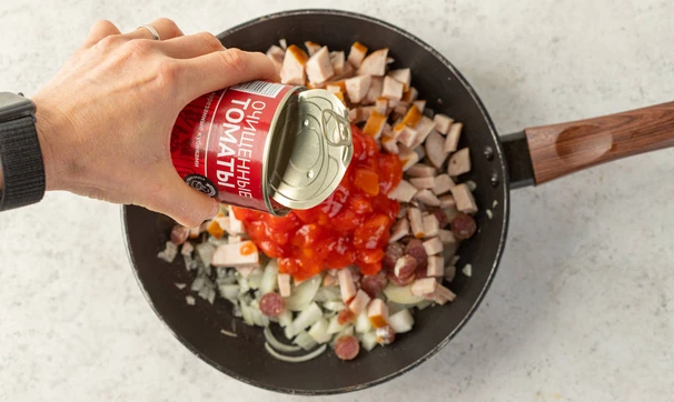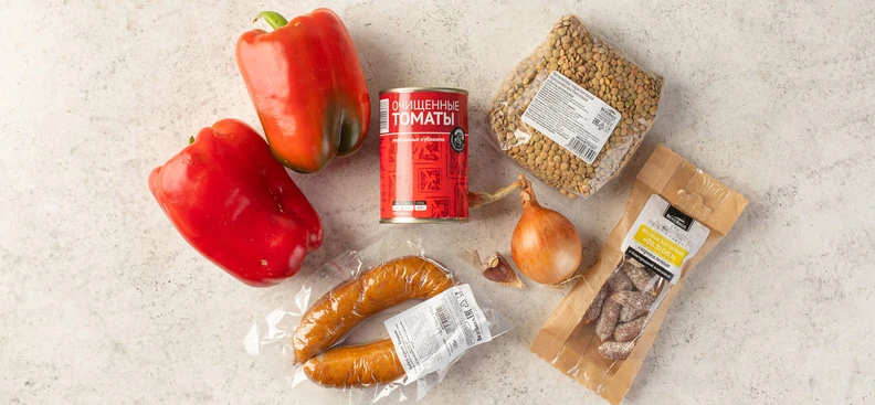 В рецепте используются товары из категорий: Овощи, фрукты, ягоды, зелень; Масла, соусы, специи, сахар и соль; Колбаса, сосиски, деликатесы