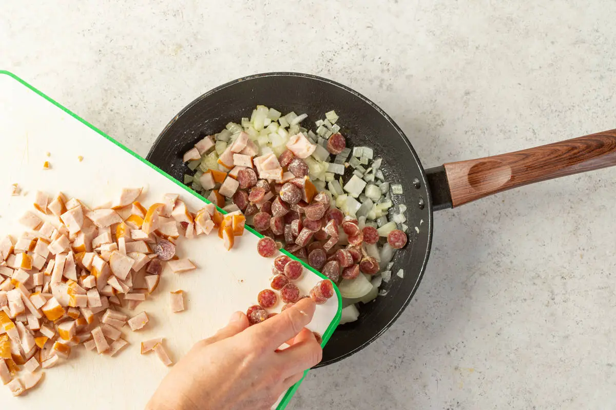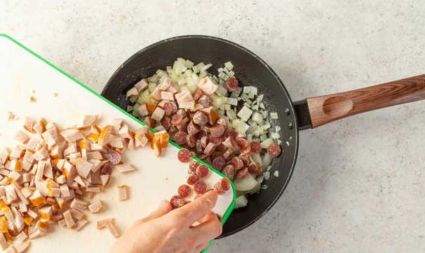 Колбаски Фелино нарежьте тонкими кружочками, куриную колбасу — кубиками.