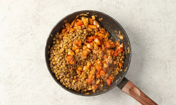 Добавьте чечевицу, паприку, посолите и перемешайте.