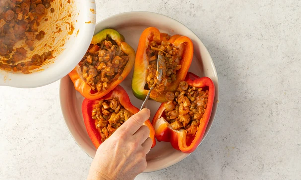 Фаршированные перцы «Лодочки» с колбасками и чечевицей