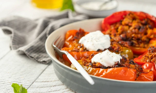 Небанальный рецепт фаршированных перцев в испанском стиле. За счёт колбасок в составе начинки вкус блюда приобретает нотку копчёностей. А чечевица — отличная альтернатива рису.
