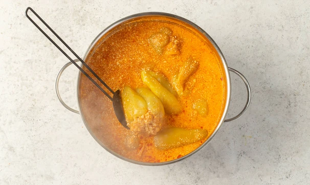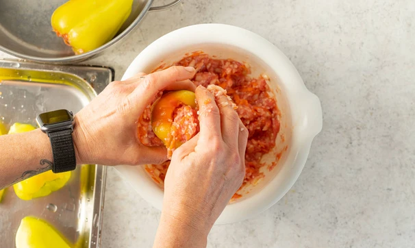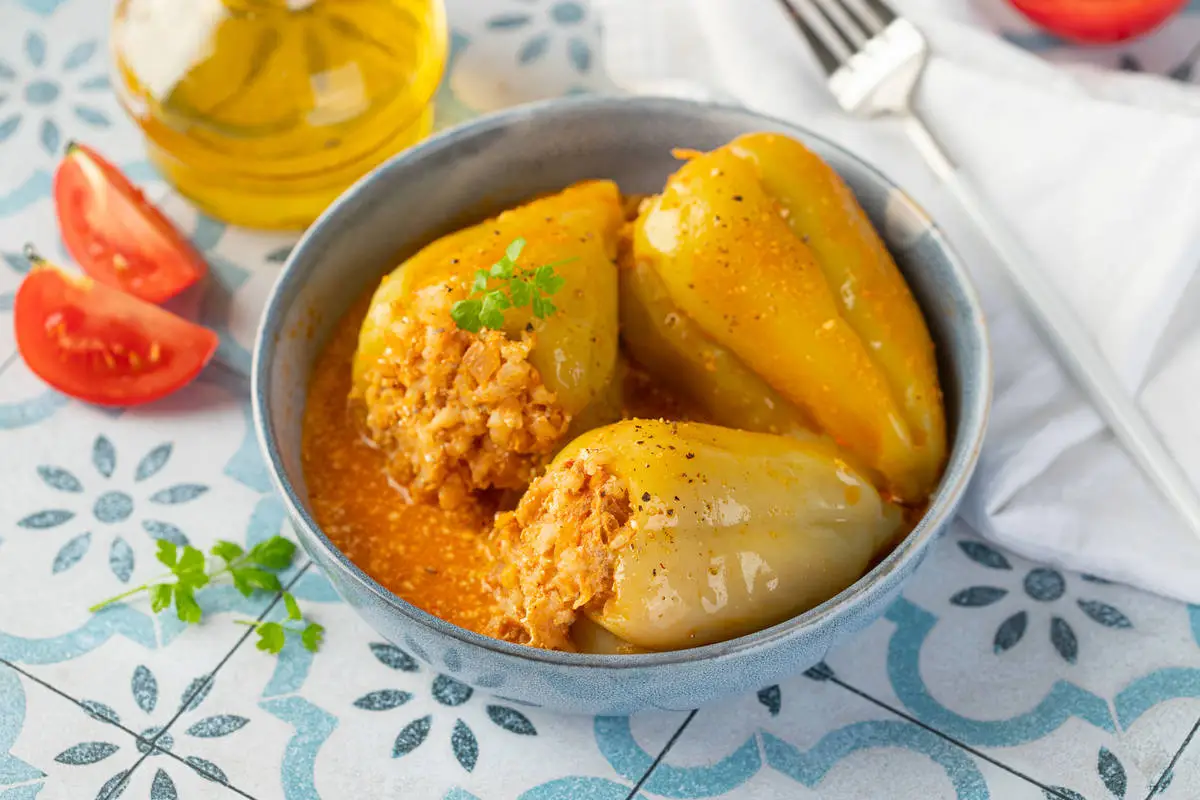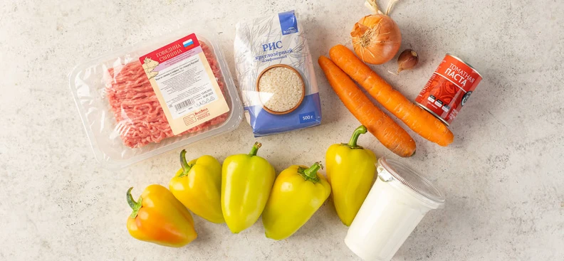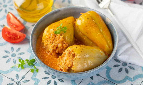 Уютное домашнее блюдо для семейного обеда. По классическому рецепту все ингредиенты смешиваются в сыром виде без предварительного обжаривания. Это уменьшает время приготовления, а перцы получаются более полезными.