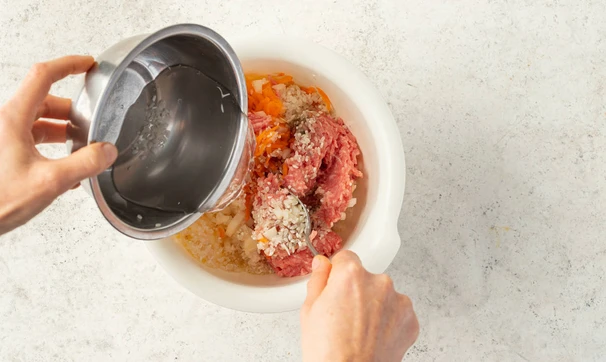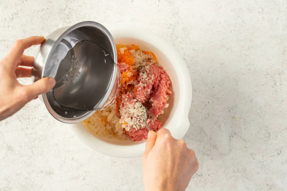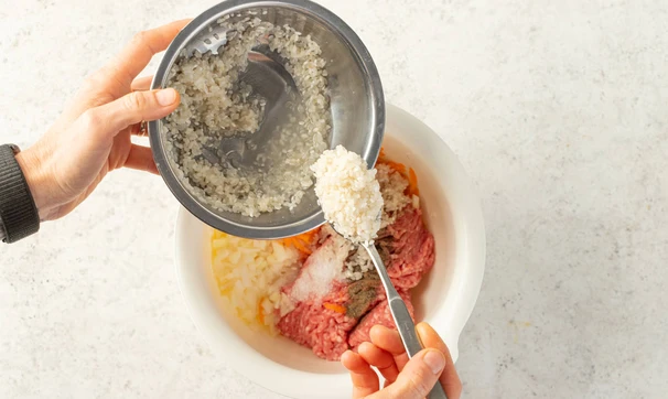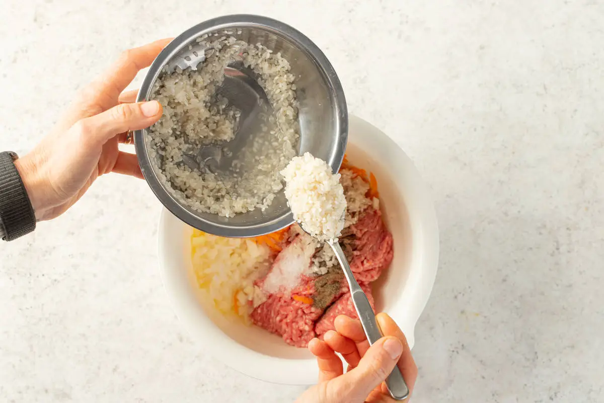 Рис промойте, смешайте с фаршем и овощами, посолите, поперчите.