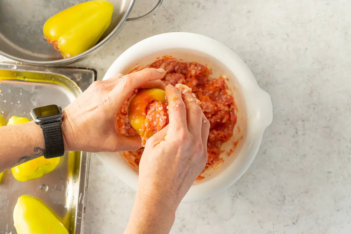 У перцев аккуратно срежьте верхнюю часть и удалите семечки. Нафаршируйте перцы начинкой не слишком плотно.