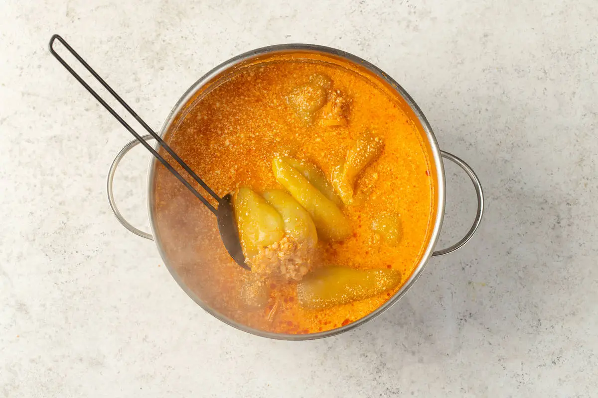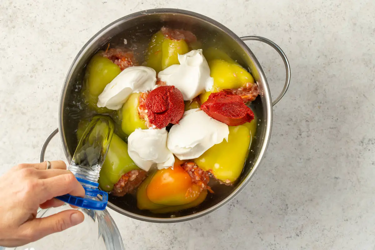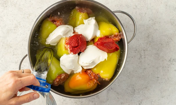 Сложите перцы в кастрюлю, влейте стакан воды, доведите до кипения и убавьте огонь. Добавьте в кастрюлю сметану и томатную пасту, посолите.