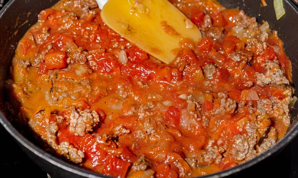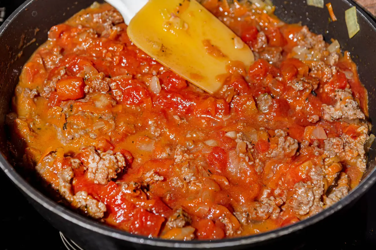 Добавьте к фаршу томаты, специи и половину чайной ложки сахара. Посолите, перемешайте и томите ещё 15 минут.