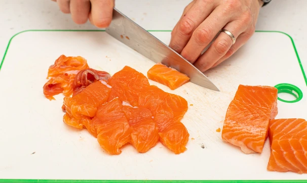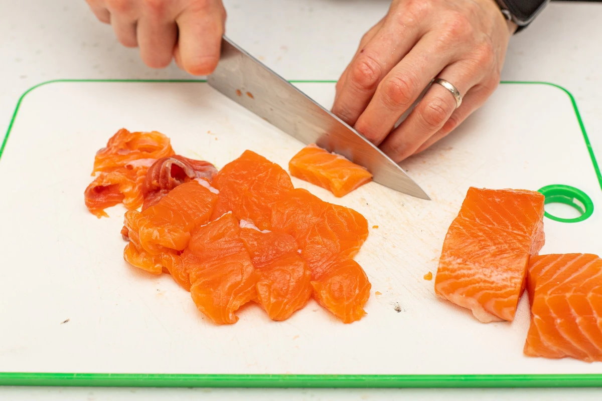Филе сёмги снимите с кожи, удалите пинцетом косточки, если есть. Нарежьте филе небольшими кусочками.