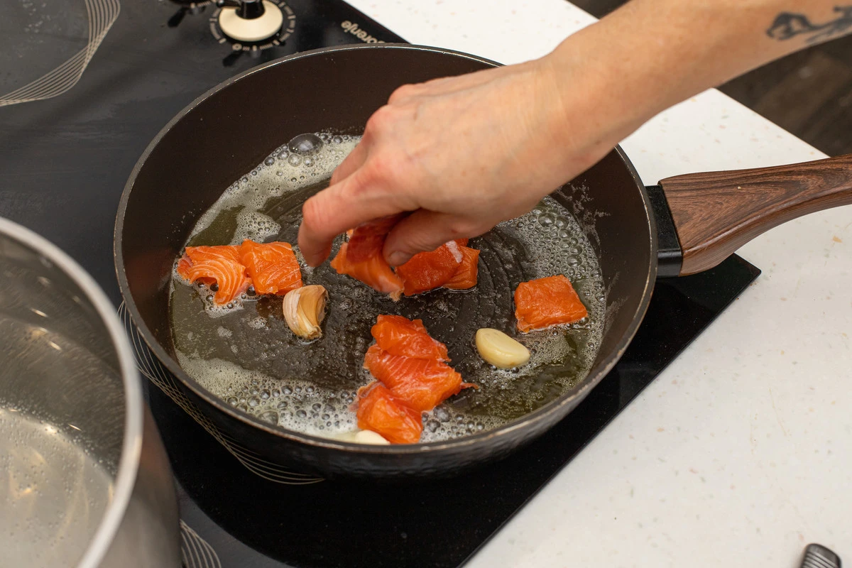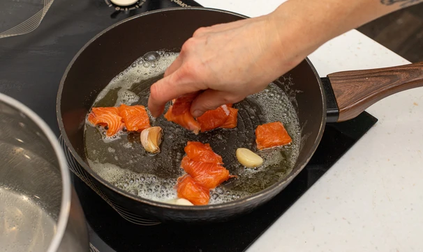 Обжарьте кусочки рыбы с одной стороны до золотистости пару минут.