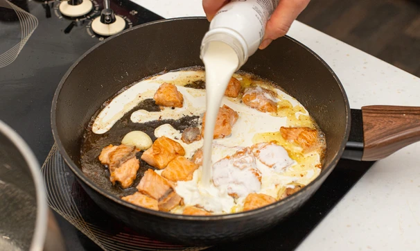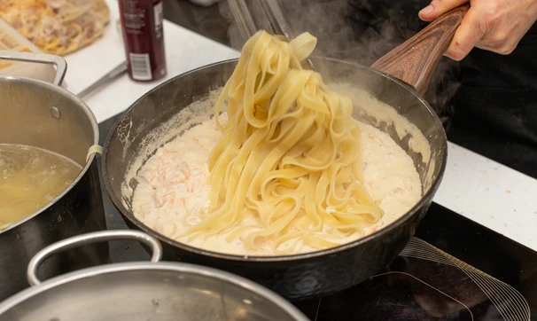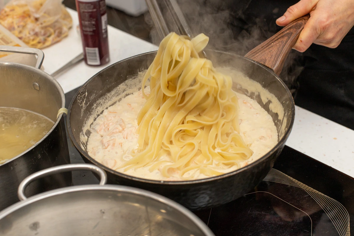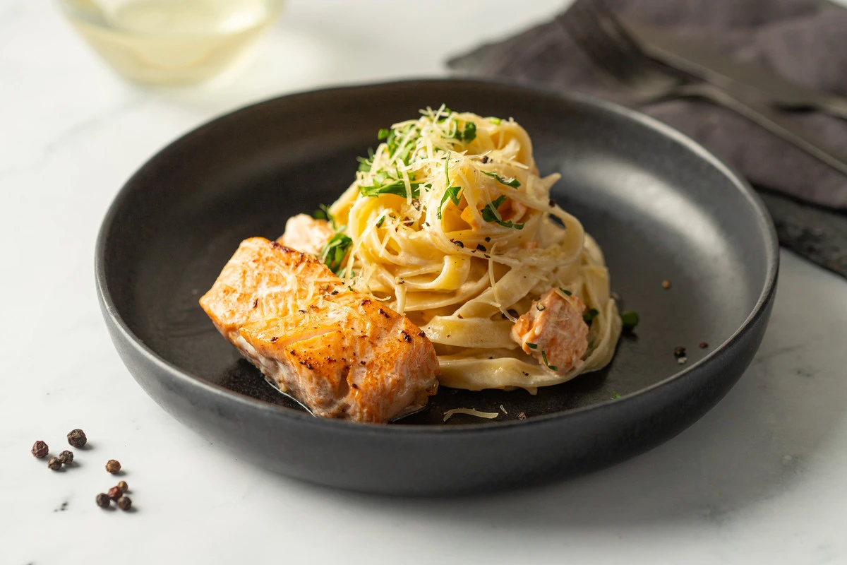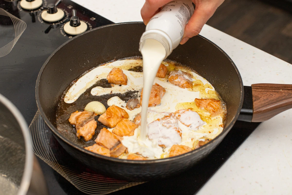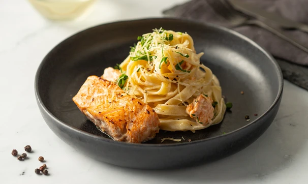 Нежная сливочная паста с сёмгой. Вы можете обжарить красную рыбу, как сделали мы, а можете предварительно запечь её в духовке целым куском и раскрошить потом в сливки.