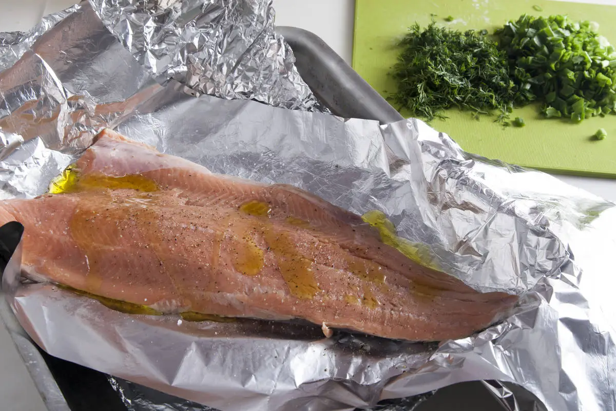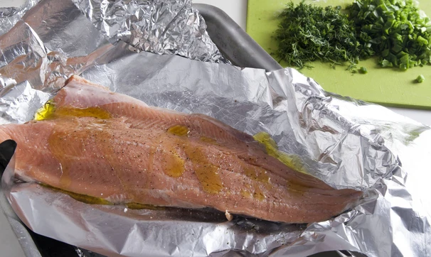 Рыбу предварительно разморозьте на самой холодной полке холодильника. Промойте, обсушите и выложите на смазанный маслом лист фольги, посолите, поперчите.